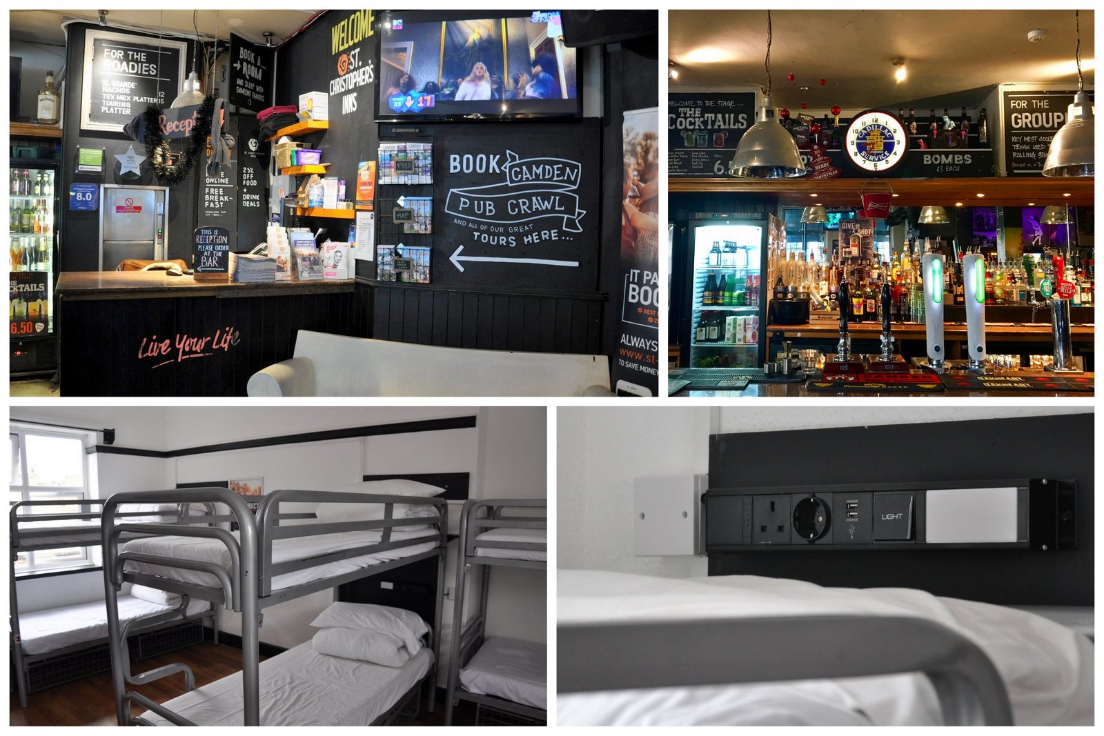 Si vous cherchez un hôtel pas cher, je vous recommande le St Christopher’s Inn Camden Hostel. Sur Camden High Street, juste en face de Miller Street, c’est une très bonne adresse, à mi-chemin entre les métros Mornington Crescent et Camden Town. L’hébergement se fait majoritairement en dortoirs, de 6 à 10 lits, mais il y a aussi des chambres doubles. Les dortoirs sont bien aménagés, avec wifi et casiers pour mettre ses affaires en sécurité (il faut apporter son cadenas). Chaque lit est équipé de prises (UK, France et USB) et lumières individuelles. Autre plus: l’hôtel est situé juste au-dessus d’un pub, le Belushi’s, et on a 25% de réduction sur la nourriture et des promotions sur les bières en tant que résident de l’hôtel.