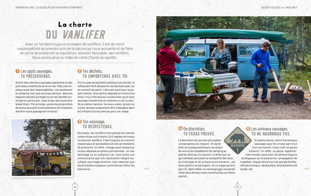 Au début, le livre propose une section « voyage en van mode d’emploi », très utile pour les novices qui ont envie de se lancer dans ce mode de voyage. Au-delà des ennuis mécaniques qui peuvent survenir sur la route, un des points les plus épineux est de trouver des endroits où se garer pour passer la nuit. Pour ceux qui n’ont pas de van mais aimeraient bien tenter l’aventure, une bonne solution, c’est d’en louer un, pour tester en vrai ce mode de voyage.
